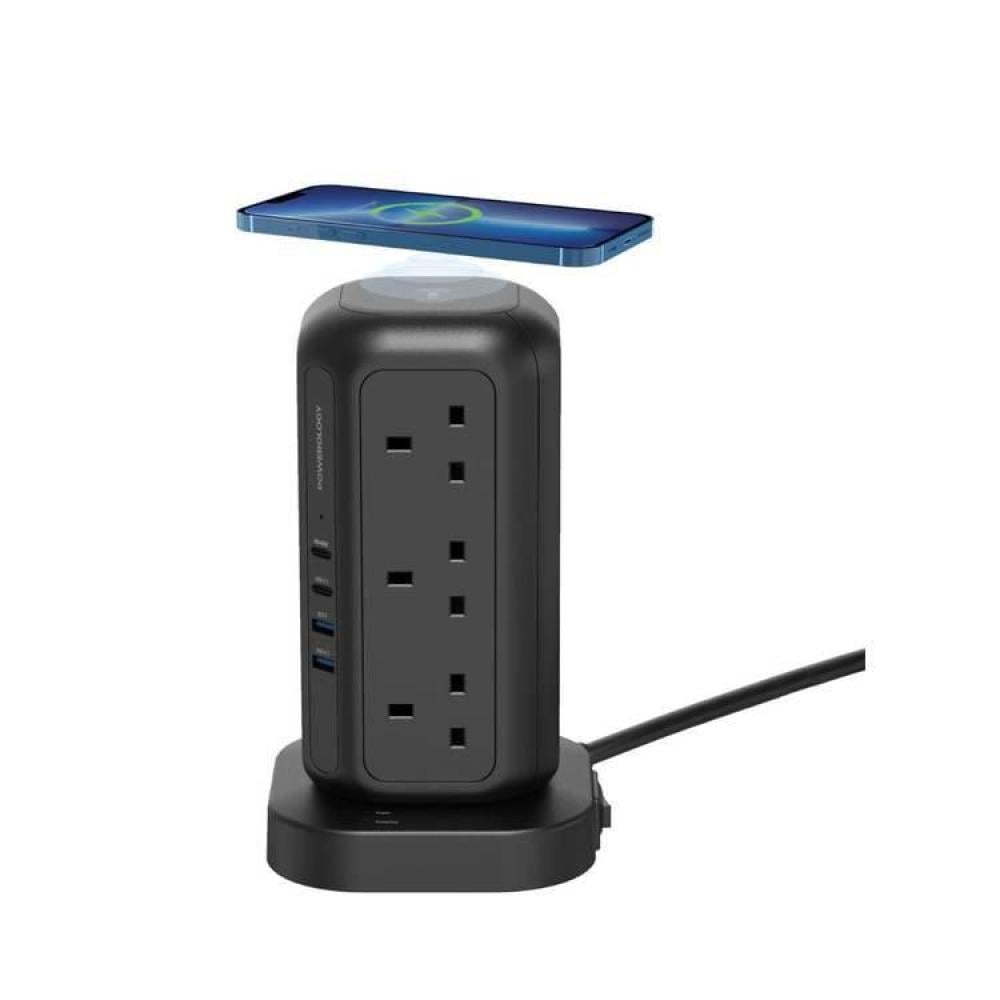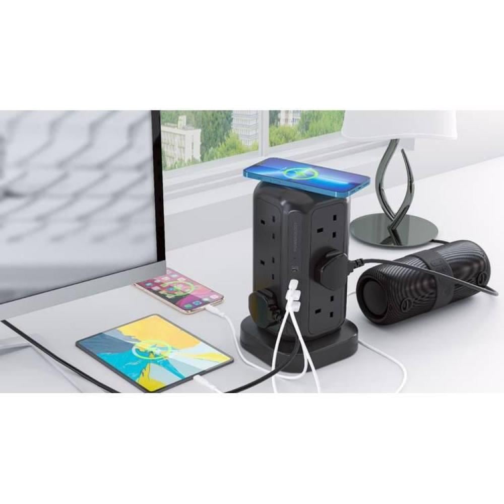 الخاصة بمركز البرج هذا على شحن أجهزتك GaN تساعد تقنية بطريقة أفضل وسريعة, وهو أمر رائع, كما أن الميزة المميزة مثل مفتاح التحميل الزائد تحمي بطارية أجهزتك. يوفر هذا المحور ومقابس متعددة ,USB-A USB-C البرجي منافذ متعددة مثل و12 مقبسًا يمكن أن تكون خيارًا ذكيًا للبيئات المزدحمة ومتعددة الأدوات مثل المكتب. أخيرًا, يوجد في الجزء العلوي من هذا .المحور البرجي شاحن لاسلكي سريع لشحن جهازك بقوة 15 واط